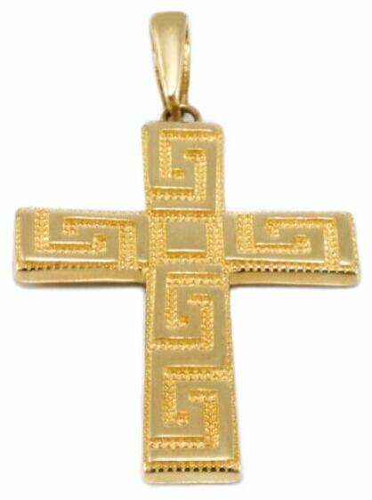Modern stílusú, mattítással és fényes mintával díszített arany kereszt medál.