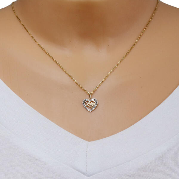 A 375 arany medál szabályos szív alakú, amelyet apró bevágások és egy "Love" - "Szerelem" felirat díszít. A szív körvonala 9K fehér arannyal aranyozott. A láncra kerülő szem hosszúkás és felfelé szélesedik. A medál mérete: 13 x 12 mmA láncra kerülő szem szélessége: 1,5 mmA medál súlya: 0,5 gFémjelzéssel ellátva. Medál lánc nélkül.