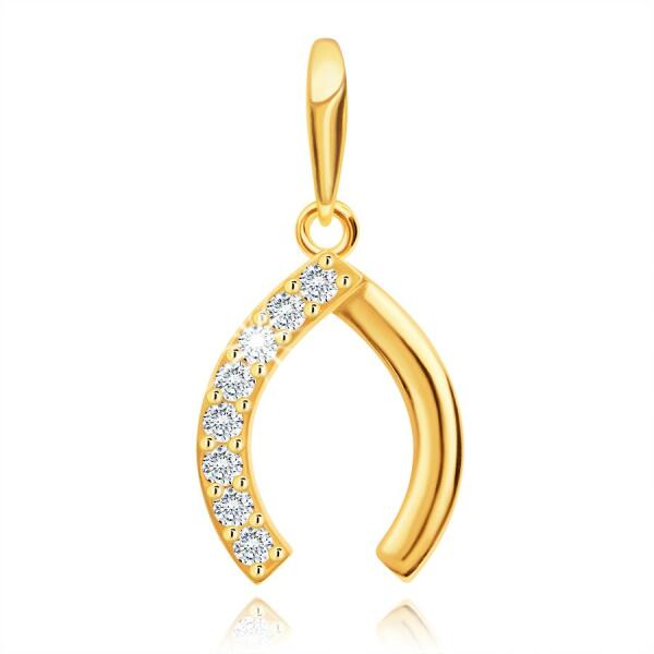 585 sárga arany medál pici patkó formájában, amely a szerencse szimbóluma. Felülete tükörfényes és sima, az egyik felét pedig áttetsző cirkóniák díszítik. A medál felső része spicces végződésű. A medál hátsó oldala tömör. A láncra kerülő szem vékony és hosszúkás alakú. Medál mérete: 9 x 11 mmMedál súlya: 0,5 gA láncra kerülő szem szélessége: 1,5 mmFé