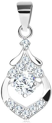 Medál 925 ezüstből kivágott cseppkörvonal alakban kerek átlátszó cirkóniával a közepében. A cseppkörvonal oldala sima és fényes, a felső részén pedig beültetett átlátszó cirkóniák találhatóak. A medál része a fényes sima láncra kerülő szem is. Medál mérete: 10 x 18 mmA láncra kerülő szem szélessége: 3 mmSúly: 1,2 gFémjelzéssel ellátott. Medál lánc nélk