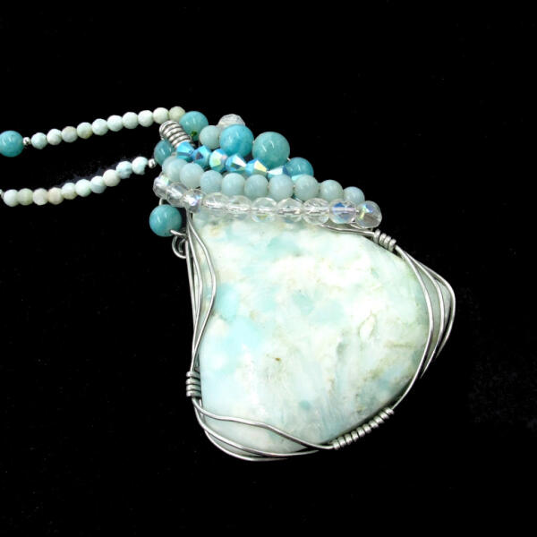 Nagyon ritka, egy nagy méretű természetes hemimorfit ásványból készítettem egyedi drót ékszer medált, melyet larimár, amazonit, swarovski kristályokkal díszítettem, A foglalat orvosi acél huzal. A nyaklánc fazettált larimár, és amazonit gyöngyök. A nyaklánchoz larimár fülbevaló tartozik. A hemimorfit vélt hatása: ITT A larimár vélt hatása: ITT Amazonit vélt hatása: