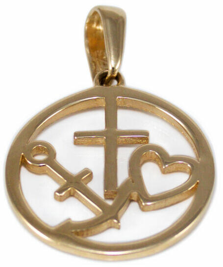 Klasszikus és kedvelt fazonú, áttört kialakítású, kerszt-szív-horgony arany medál.