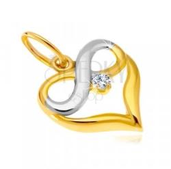 14K kombinált arany medál, szív körvonal alakzat. A szív felső részét egy végtelen szimbólum egészít ki. A fekvő nyolcas egyik fele sárga arany, a másik fele fehér arany bevonatú. A szimbólum alatt egy csillogó cirkónia helyezkedik el, amely enyhén kidomborodik. A medál felülete sima, tükörfényes. Láncra kerülő szem vékony és ovális alakú. Medál mérete: 12 x 12 m