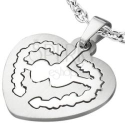 Sebészeti acélból készült medál, szív alakú lap matt ezüst színben. A medál belsejében fényes mintázat található nyíllal átlőtt kettős szív forma, mely kiemelhető a matt keretből. A láncra kerülő szem nagysága: 5 mmMéretei: 30 x 30 mmAz ár egy medálra vonatkozik.