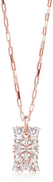 Prémium minőségű ezüst nyaklánc medállal. 18 karátos rozé arany bevonat. AAA kategóriás foglalt cirkónia kövek. Két különböző féle csiszolású kövek. Állítható hosszúságú lánc. Különleges minőségű gyári díszcsomagolás. Ékszer anyaga : Sterling ezüst Finomság : 925 ezrelék Szín : sárga arany Lánchossz : 45+5cm Medál méret : 18mm x 11mm Kövek : AAA minő
