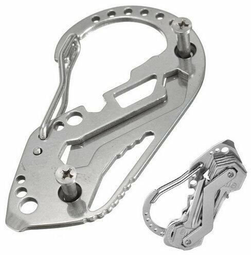Praktikus karabiner - utazási eszköz, de mindennapi használatra is hasznos. Ennek köszönhetően kinyitjuk a palackot, eltávolítjuk a csavart és eltávolítjuk a szigetelést a kábelről. Felhasználása nagyon széles, mindig kéznél tarthatjuk. Rozsdamentes acélból készült. Méretek: 8,5 x 4,5 cm.