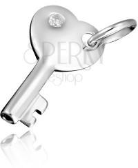 925 - ös ezüstből készült függő - fényes kulcsocska. A kulcs szárát üreges csövecske alkotja, a kulcs feje szív alakú. A fej bal oldalába gömbölyű tiszta cirkonkő van ágyazva, a jobb oldali részbe került a láncra kapcsolható szem. A függő mérete: 14 x 25 mmA láncra kerülő szem szélessége: 5 mmA medál lánc nélkül kapható. A függő súlya: 2,8 gFémjelzéssel el