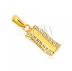 585 sárga arany medál, enyhén hullámzó sávból. Oldalain függőlegesen cirkóniákkal van kirakva. A kisebb méretű cirkóniák csiszoltak, átlátszóak és kerek alakúak. A medál közepén végig húzódik egy sima, hosszúkás rész fényes felülettel. A láncra kerülő szem felfelé enyhén szélesedik. Medál mérete: 5 x 10 mmMedál súlya: 0,4 gLáncra kerülő szem szélessége