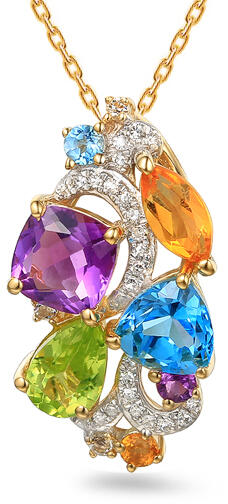 A színes drágakövek gyémánttal kombinált gyengéd érintése és a sárga arany szépsége a Dubai kollekció medálját adja. Egy jellegzetes díszítéssel van díszítve, amely akár öt drágakővel - ametiszt, kék topáz, citrin, peridot és fehér topáz - van kirakva, összesen 1,940 karát súlyban. Huszonhat csillogó gyémánt, összesen 0,060 karátos, H színű és SI1 tisztasá