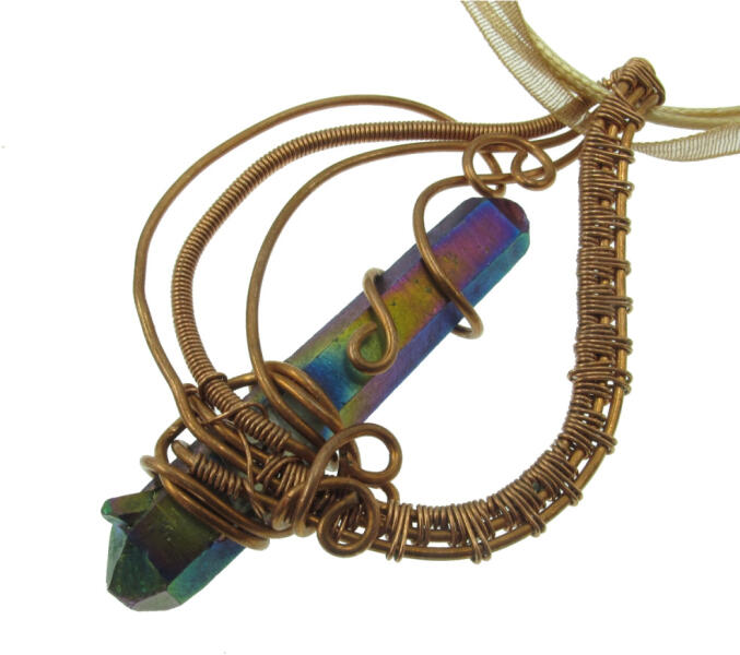 Szibériai aurakvarc kristály medál, réz foglalatban. Kristály mérete:8*45mm Medál magassága: 66mm Az aura kvarcok, annak ellenére, hogy alkímiai folyamatokkal, mesterségesen készült kristályok, rendkívül erős az energiája. A szibériai aurakvarc természetes hegyikristály csúcs, kobalt ötvözettel. A rézzel számomra egy misztikus fém foglalatot tudok létrehozni, ezer arcot