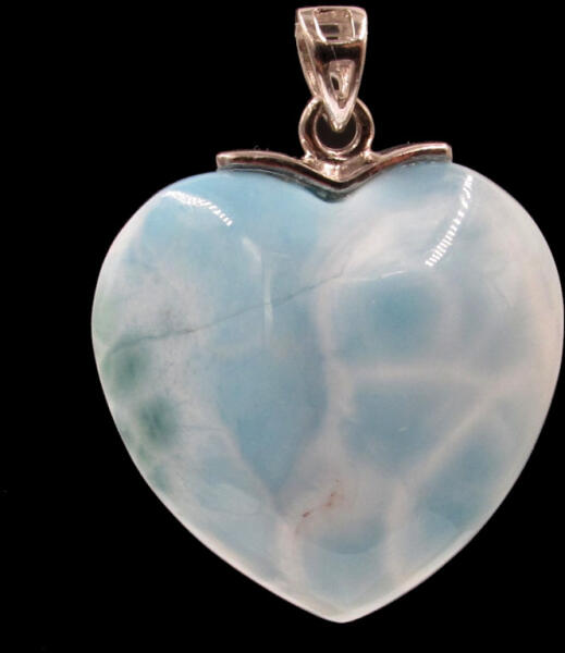 Nagyon ritka, természetes Larimar (Larimár, kék pektolit, vagy delfinkő néven is ismert) ásványból készült, (duci) szív csiszolású medál. Gyönyörű ég-kék színű, felhőszerű rajzolatú, (mely az ásvány valódiságára jellemző) szív csiszolású cabochon drágakő. Bővebb információ "ADATOK PARAMÉTEREK" fül alatt. A Larimar vélt hatása