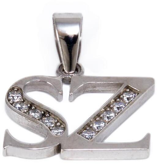 Kedvelt fazonú, cirkónia kősorral ékített, ródiummal bevont "SZ" betű arany medál.
