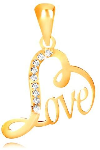 9K sárga arany medál díszes "Love" - "Szerelem" felirattal. A medál egyik oldalát átlátszó, kerek cirkónia sáv alkotja. A láncra kerülő szem hosszúkás, felfelé enyhén szélesedik. Medál méretei: 16 x 13 mmSúly: 0,3 gLáncra kerülő szem szélessége: 2 mmFémjelzéssel ellátott. Medál lánc nélkül.