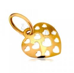 A 14K sárga arany medál szabályos, domború szív formájú, amelynek felülete sima, fényes és különböző méretű szív alakú vágatok díszítik. A láncra kerülő szem keskeny és ovális formájú. Medál méretei: 9 x 8 mmMedál súlya: 0,1 gLáncra kerülő szem szélessége: 2 mmFémjelzéssel ellátott. Medál lánc nélkül.