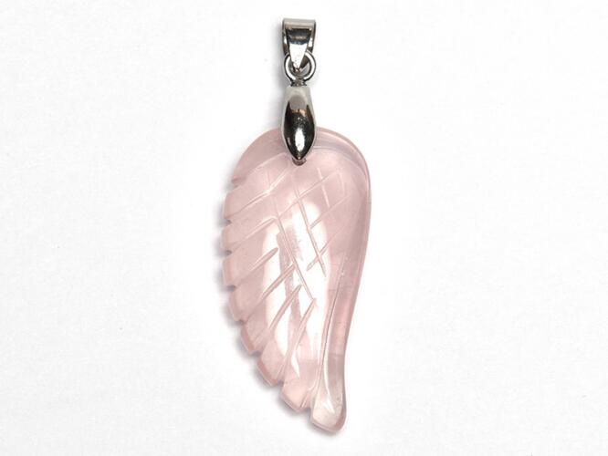 Rózsakvarcból készült 3x1,5 cm-es metszett angyalszárny. Antiallergén fém medáltartóval együtt a magassága kb. 5 cm. Az ásványok nem helyettesítik az orvosi diagnózist és kezelést. A rózsakvarc hatása : a rózsakvarc szerelmet és gyengédséget ébreszt. Szerepet játszik a lelki sérülések begyógyításában. A rózsakvarc nemcsak a lelket teszi nyitottabbá, de fogékonya