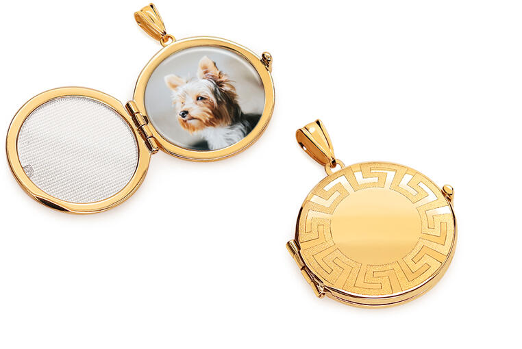 Arany kerek fényképtartó medál antik mintával, modell IZ27167