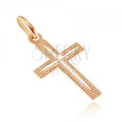 Lapos medál sárga aranyból, melynek a felületét finom felületű csillogó kinézetű arany alkotja. A szárak közepén sima fényes keskeny sávok húzódnak kereszt alakban. A medál méretei: 16 x 29 mmA medál súlya: 0,6 gA láncon lévő szem szélessége: 3 mmFémjelzéssel ellátott. Medál lánc nélkül.