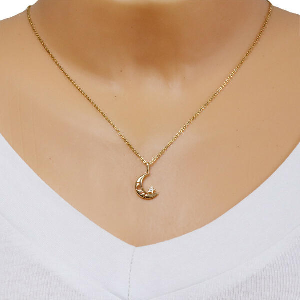 14K sárga arany gyémánt medál, amelyet egy hold díszít, vésett „LOVE(SZERETET) felirattal. Az írásban az „o betűt egy szív véset helyettesíti. A hold alsó részén egy fényes briliáns csillag található, fényes kontúrral. A medál keskeny lánckapoccsal rendelkezik, amely a teteje felé kissé kiszélesedik. Medál mérete: 10 x 14 mmA kapocs szélessége: 1,5 mmMedál töme