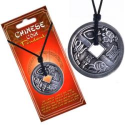 A nyakláncot egy vékony, fekete madzag alkotja, amelyet matt, ón ötvözetből készült patinás fémmedál díszít. A medálnak pénzérmealakjavan, melynek a felszínén kínai jelek találhatók és a másik oldalát állat motívumok díszítik. Kiemelkedő, sima széle van. A közepén egy négyzet alakú kivágás található, melyen keresztül van fűzve a madzag. Állíthatóhossz. A