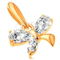 14K sárga arany medál csillogó pillangó alakban, amely szárnyai könnycsepp alakú cikóniák, valamint egyik részen sima felületű arany. A láncra kerülő szem hosszúkás alakú. Medál mérete: 10 x 7 mmSúly: 0,6 gLáncra kerülő szem szélessége: 1,5 mmFémjelzéssel ellátott. Medál lánc nélkül.