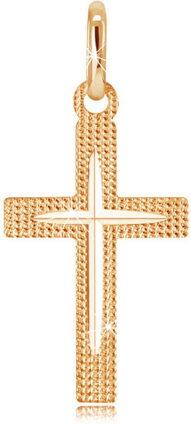 Medál sárga aranyból, felszíne enyhe mintával díszített mely csillogó látszatot kelt. A szárai közepén egy sima fényes keskeny bevágás húzódik kereszt alakban. Méretek: 13 x 23 mmA medál súlya: 0,6 gA láncon lévő szem szélessége: 3 mmMedál lánc nélkül. Fémjelzéssel ellátott.