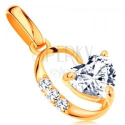 A 14K sárga arany medál egy ovális körvonalból áll, amely az egyik oldalán három apró, kerek cirkóniával, a másik oldalán pedig egy csillogó, csiszolt, átlátszó szívvel van díszítve. A szív alakú cirkónia három fényes pálcikával van megfogva. A láncra kerülő szem ovális és sima, fényes felülettel rendelkezik. Medál méretei: 8 x 10 mmMedál súlya: 0,5 gA láncra