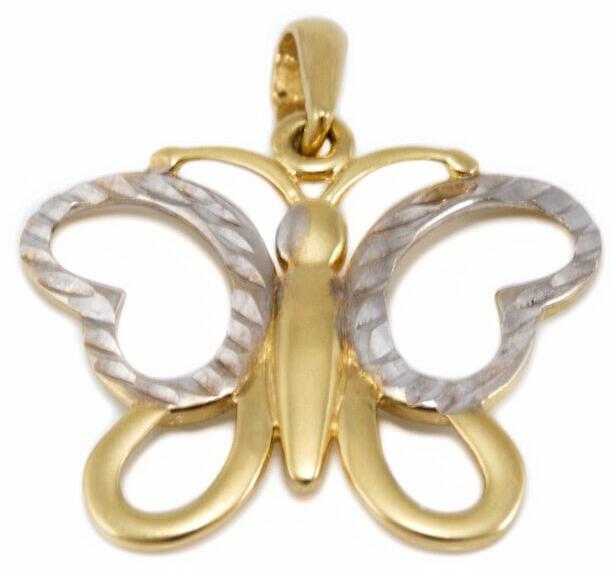 Modern stílusú, véséssel és ródiummal ékített, áttört pillangót ábrázoló mutatós arany medál.
