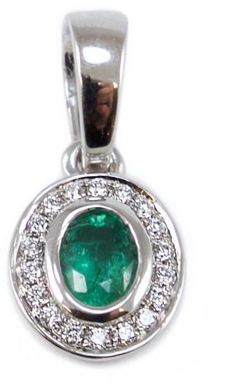 Kedvelt fazonú, ovális fehérarany medál smaragddal és gyémánt kövekkel ékítve.