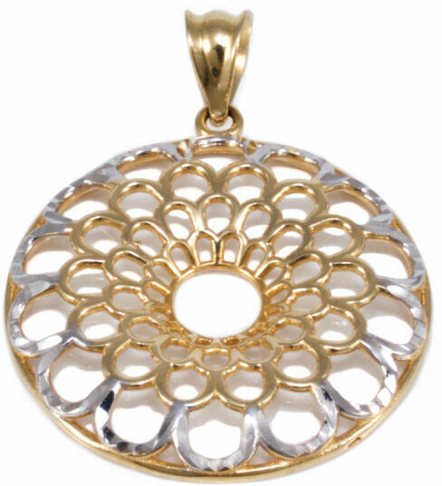 Modern stílusú, kedvelt fazonú, ródiumma és véséssel díszített, áttört kialakítású arany virág medál.