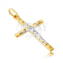 Fehér arany medál - Jézus Krisztus a kereszten. A feje felett egy pergamen forma tábla található, szintén fehér aranyból, gravírozott INRI felirattal. A kereszt sárga aranyból készült és a felületét kidomborodó piramis formák díszítik. Az akasztó vékony és ovális. A medál méretei: 18 x 31 mmA medál súlya: 1,0 gA láncra kerülő szem nagysága: 3 mmFémjelzéssel ellá