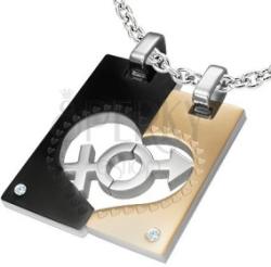Orvosi acélból készült téglalap alakú medálok kivágott fél szívecskével. A nagyobbik rész fekete, NŐ szimbólummal, a kisebbik rész aranyszínű FÉRFI jellel. A szív kivágást mindkét medálon bevésett pici szívek veszik körül, alsó sarkukban beágyazott cirkonkő van. Méret: 15x 35 mm a 13 x 30 mmA medálon található szem átmérője: 4 mmA medálok lánc nélkül kaphat