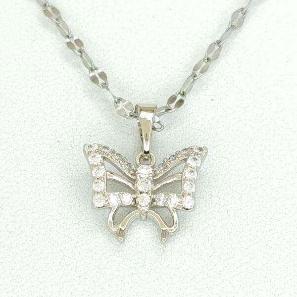 Ezüstszínű, csillogó fehér cirkónia kristállyal díszített pillangó medál. A kristályok karmos foglalatban helyezkednek el. Időtálló ékszer, víz hatására nem feketedik. Antiallergén ékszer. Medál mérete: 12 mm x 15 mm. A nyakláncok különböző méretben kérhetők, ezek mintája esetleg eltérhet a képen láthatótól, szélessége 2 mm vagy 3 mm. Az antiallergén ékszer