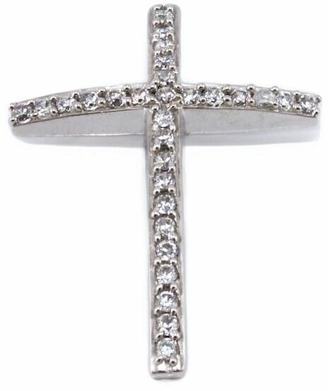 Modern stílusú, kedvelt fazonú, ródiummal bevont, cirkónia kővel ékített, fehéraranyarany kereszt medál.