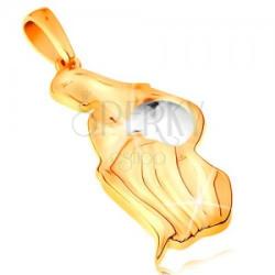 Kombinált 14K arany medál a VÍZÖNTŐ csillagjegy szimbólumával. A medált egy női alak alkotja, amely egy korsó vizet tart a kezében. A medál sárga aranyból készült, az edényt fehér arany réteg díszíti. A láncra kerülő szem fényes és hosszúkás. Medál méretei: 9 x 19 mmMedál súlya: 1,1 gLáncra kerülő szem szélessége: 2 mmFémjelzéssel ellátott. Medál lánc nél