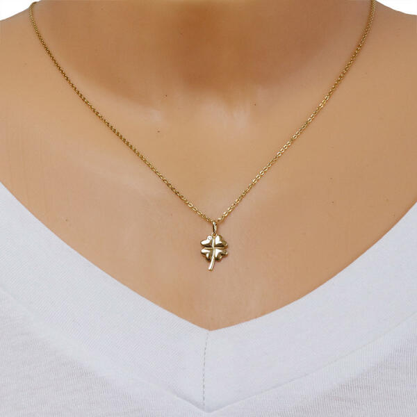 Gyémánt medál 9K sárga aranyból, négylevelű lóhere, szív alakú levelekkel és keskeny szárral. Az egyik levélbe briliáns van beágyazva. A négy levél tükörsimára csiszolt. A lánckapocs hosszúkás és a teteje felé kiszélesedik. Medál mérete: 10 x 14 mmA kapocs szélessége: 1,5 mmMedál súlya: 0,59 gGyémánt átmérő: 1,5 mGyémánt karát össztömeg: 0,013 ctTisztaság