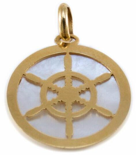 Modern stílusú, gyöngyházzal díszített, hajókerék kerek arany medál.