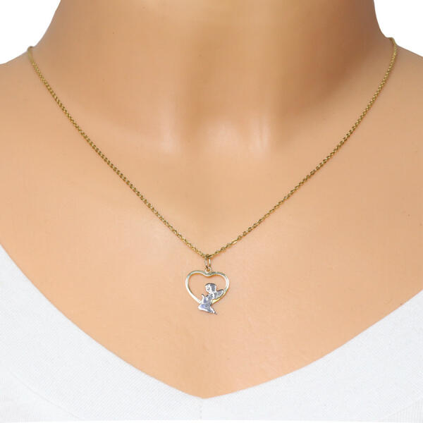 Kétszínű 9K arany medál egy fényes vonalból szív alakban sárga aranyból és egy imátkozó angyalból fehér aranyból, amely a szív alsó részében helyezkedik el. A medál felülete ródiummal kezelt. A láncra kerülő szem ovális alakú. A medál méretei: 14 x 16 mmA medál súlya: 0,2 gA láncra kerülő szem szélessége: 2 mmFémjelzéssel ellátott. Medál lánc nélkül. A r