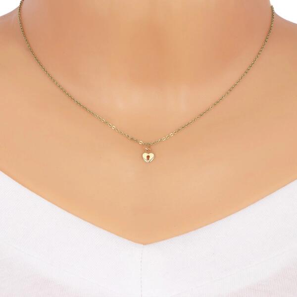 A 9K sárga aranyból készült arany medál egy zárat formáz egy enyhén domború, szimmetrikus szív alakjában. A szívet alul kulcslyuk kivágás díszíti. A medál sima és tükörsima felületű. A láncra kerülő szem egy egyszerű ovális láncszem. A medál méretei: 7 x 5 mm A láncra kerülő szem szélessége: 2,5 mm A medál súlya: 0,11 g Fémjel - van. A medál lánc nélkül va