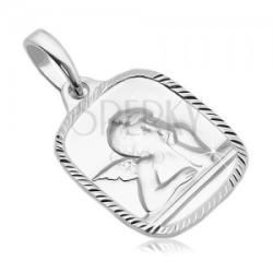 A 925 ezüst medál lapos téglalap alkú, kidomborodó angyallal díszítve, amely tenyerével támasztja az állát. A medál sarkai lekerekítettek és szegélye bordás. A láncra kerülő szem ovális alakú. Medál méretei: 13 x 15 mmMedál súlya: 1,95 gLáncra kerülő szem szélessége: 4 mmFémjelzéssel ellátott. Medál lánc nélkül.