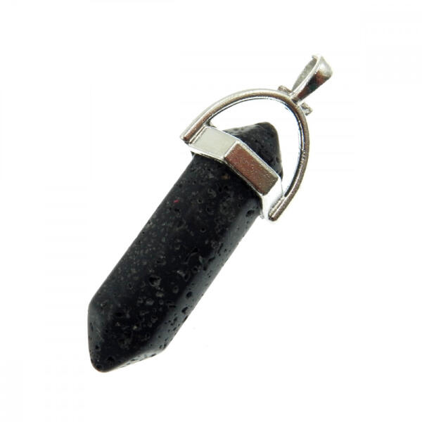 Két-csúcsú, hatszögletűre csiszolt lávaköves medál. A csúcsos forma kialakítása miatt ingázásra is alkalmas. Medál mérete: 8*30mm Teljes magassága: 40mm Az ametiszt gyógyhatása