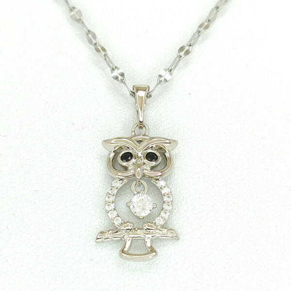 Ezüstszínű, csillogó fehér cirkónia kristállyal díszített bagoly medál. A kristályok karmos foglalatban helyezkednek el. Időtálló ékszer, víz hatására nem feketedik. Antiallergén ékszer. Medál mérete: 13 mm x 23 mm. A nyakláncok különböző méretben kérhetők, ezek mintája esetleg eltérhet a képen láthatótól, szélessége 2 mm vagy 3 mm. Az antiallergén ékszerek