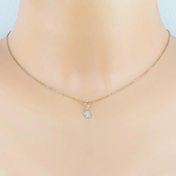 A 14K sárga aranyból készült medál lánchoz vagy karkötőhöz egy mitikus lényt, egyszarvút ábrázol. Fehér testből, rózsaszín sörényből áll, a fején kis, világoskék szarvval kiegészítve. A részletes rajz és a körvonalak aranyszínű kivitelben készültek. A medál egy rugós gyűrű segítségével karkötőre vagy láncra rögzíthető. Medál mérete 6 x 9 mm Medál s