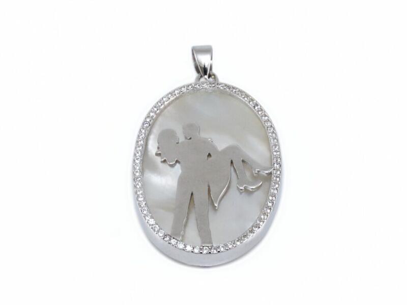 Különleges és egyedi, cirkónia kövekkel ékített ovál keretben gyöngyház alapon női és férfi alakkal díszített csodálatos ezüst medál.