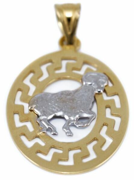 Modern stílusú, kedvelt fazonú, ródiummal díszített, "meander" mintával áttört, kétszínű "kos"arany medál.