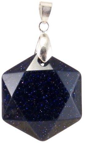 Hexagon formára csiszolt kék napkő (éjkő) medál. A kék színű napkő, vagy éjkőként is ismert szintetikusan előállított kristály. Goldfluss, vagy goldstone-ként is ismert, nagyon mutatós, csillámló kristály. Az éjszakai csillogó égboltot idézi elénk. Némi gyógyhatást is tulajdonítanak neki, mivel rezet és egyéb összetevőket is tartalmaz. A medál mérete: 25x30mm A