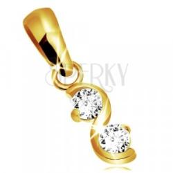 375 sárga arany medál két cirkóniával. A cirkónia kerek, átlátszó. A láncra kerülő szem hosszúkás felfelé enyhén szélesedik. Medál méretei: 3 x 8 mmMedál súlya: 0,3 gLáncra kerülő szem szélessége: 2 mmFémjelzéssel ellátott. Medál lánc nélkül.