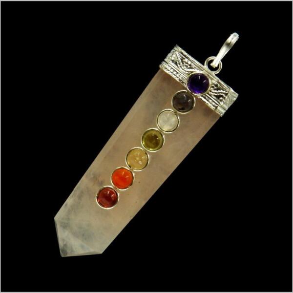 Kristály csúcs forma rózsakvarc medál, a csakrákat harmonizáló drágakövekkel. (ametiszt, iolit, holdkő, peridot, citrin, karneol, gránát). A rózsakvarc mérete: kb. :15-20mm széles, kb. :45-55mm hosszú. Ezüstözött fémbe foglalva. A medálból több darab is rendelhető, a fotó illusztráció a raktáron lévő valamely medálról készült. Az ametiszt színe, mintázata, mére