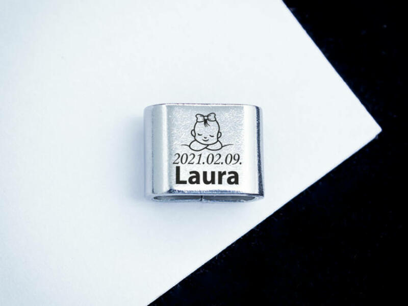 Emlékőrző ékszerben a Te varázslatod! A medálra lány gyermeked keresztnevét , és születési dátumát gravírozzuk! (Lézer gravírozott szögletes alakú nemesacél csúszó medál - 12×10 mm méretű) A medál egy nyakláncra felhúzva is hordható, de alapvetően a MoMents karkötő kollekció kiegészítőjeként elérhető. Az ár tartalmazza a gravírozás költségét. A gravíro