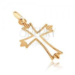 Medál sárga aranyból, kereszt szélesedő sarok kivágással. A szárak végei három rövid nyúlványra tagolódnak. A felszíne fényes, keskeny bevágásokkal, melyek a közepétől kifelé húzódnak. A medál méretei: 18 x 27 mmA medál súlya: 0,5 gA láncon lévő szem szélessége: 3 mmFémjelzéssel ellátott. Medál lánc nélkül.