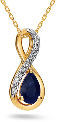 A sárgaarany női Elle medál egy elegáns ékszer nyolcas alakban, a végtelenség szimbólumaként, egy könnycsepp alakú természetes zafírral (0,39 ct) és egy sor briliáns csiszolású gyémánttal (0,06 ct) díszítve, kiváló szín- és tisztasági paraméterekkel (H, SI1). Ez a fényűző, iGold tanúsítvánnyal rendelkező kiegészítő ideális mindennapi és hivatalos viselethez e